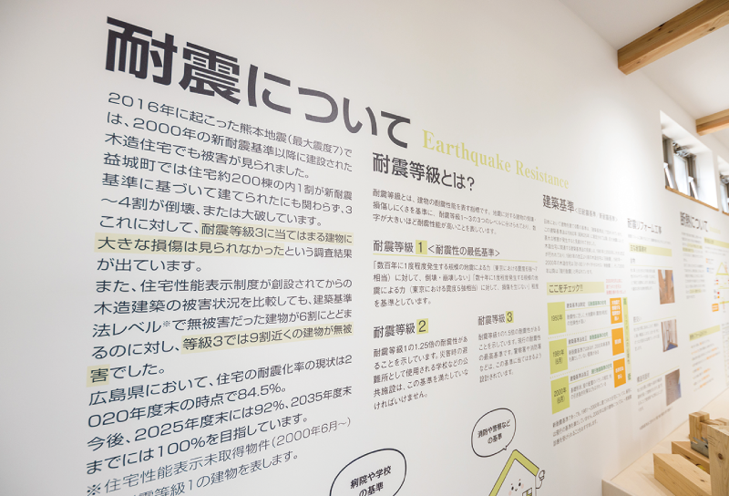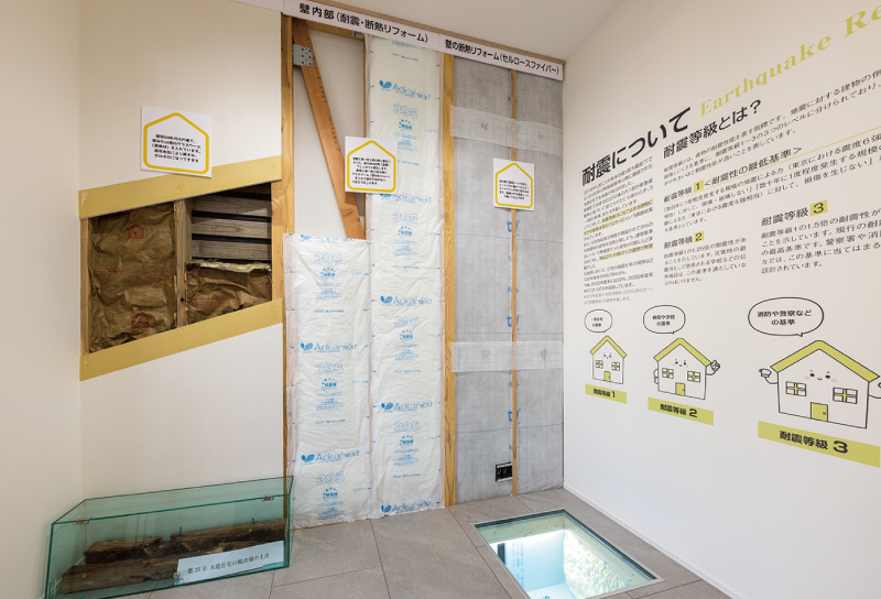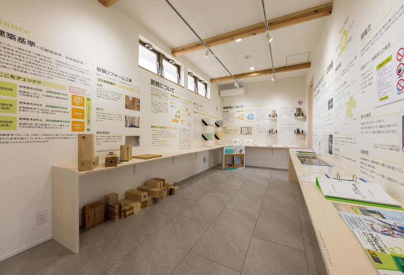 耐震・断熱リフォームについての展示ルーム、耐震リフォームで使用する建材や断熱材の実物、断熱窓や内窓の模型を展示しながら分かりやすく解説しています。