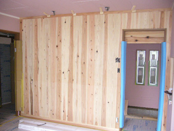 | アクセントに杉を貼ったリビングの壁 | 増築して、取り付けた玄関 |