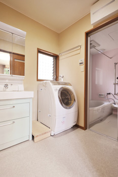 洗面所 タイル張りで掃除が大変だった浴室もユニットバスで快適に。リビングから洗面所への扉は引き戸に変えて、洗面所の面積を広げた。洗面台の横のリビングのニッチの裏側にあたる壁には壁厚を利用し埋込収納スペースを造作している。 |