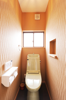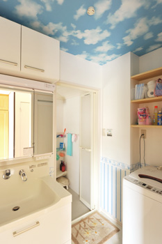 | 念願の洗濯機を設けた洗面所。天井を覆う青空の絵柄が開放的。 | 壁はご主人が好きなゴールド色に。若草色の便器がフレッシュな印象。 |