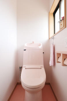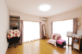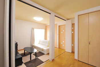 | 床、便器、ペーパーホルダーをピンク色で統一したかわいい2階のトイレ。 | 開閉式の間仕切りの採用で、使い勝手が一層よくなった2階の洋室2室。 |