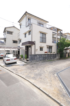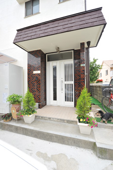 | 採光に配慮して、ガラスをはめ込んだ扉を設置したしゃれた玄関。 | 防水加工が施され、色も明るい色調に塗り替えられた美しい外壁。 |