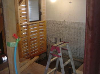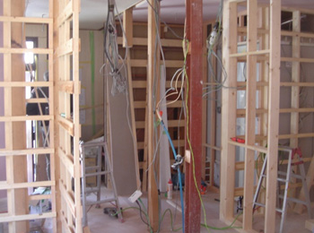 | 壁も下地ボードを張って完了です。あとはクロスを貼って仕上げていきます。 | 新しくなったお部屋の間仕切り壁下地組みです。壁の中に配線もたくさん入っています。 |