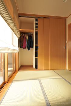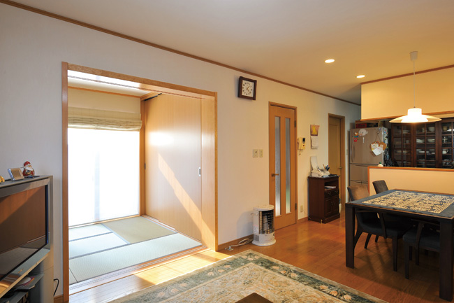 その結果、新しく誕生した和室は、単に1部屋増えただけでなく、LDKからの視界を広げる効果をもたらし、以前より開放感が高まったという。特にLDKで1日のうち多くの時間を過ごす奥さまにとってはうれしい効果で、ゆったりとした気持ちになれることも実感。壁際には天井までめいっぱい利用した大容量の収納スペースを新たに設けた。壁はお孫さんへの配慮もあって、調湿・吸臭効果に優れた珪藻土壁。照明は約4万時間も長持ちするというLEDを採用。また、和室ながらもLDKとのバランスを考慮し、ガラスブロックを明かり取りとして配置。和モダンな雰囲気を醸し出すことに成功している。