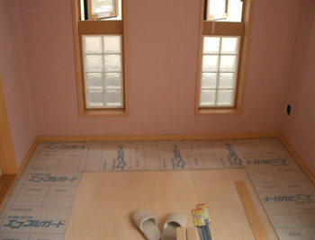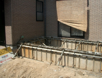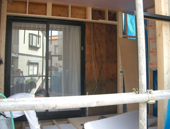 | 増築するお部屋の基礎工事です。型枠でコンクリートが固まるまでしばらく養生です。 | 部屋内の掃き出しサッシもついてお部屋のイメージができてきました。 |