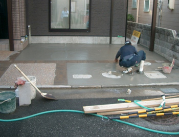 | 駐車スペースのコンクリート打ちです。レンガや玉石を使ってデザインにも工夫しています。 |