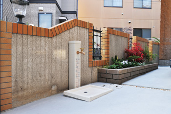 | ささやかながらも外構部分に生まれた緑が心を和ませてくれる。レンガで縁取られた壁とその向こうはお隣の敷地。 |