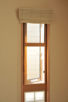 | 大容量の収納スペースは中を分割し、棚を作りつけることで使いやすいように工夫している | 和室の壁に取り付けられた小窓。必要な時だけ下ろして使えるロール網戸が便利。下の段はガラスブロック |