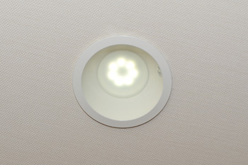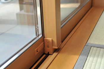 | 照明にはLED電球を採用。寿命は約4万時間と長く、電気代も従来より抑えられる省エネタイプ。微妙な調光も可能 | ペアガラスのサッシ窓。内側は和室の風合いに合わせて木目サッシ、外側は外壁に合わせてダークブラウンにしてある |