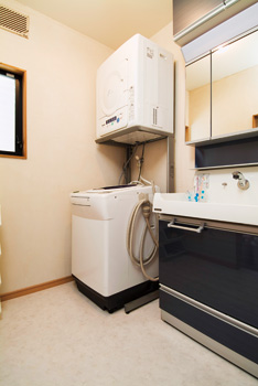 | キッチンは奥さまの妹さんがショールームに勤めているとあって、こだわりをもって選んだもの。 | 洗面室&トイレの壁は家族みんなで珪藻土塗りに挑洗面化粧台は奥さまがこのデザインを一目で気に入ったそう |