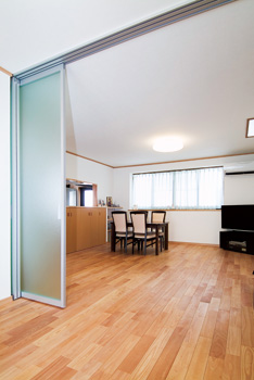 | 2階にあったピアノは窓際に設置し、弾く時のために間仕切り戸を取り付けた。キッチンカウンターの下に新しく造った収納スペースのおかげで、モノがあふれることもなくスッキリしたキッチンまわりになった。間仕切り戸はグリーンがかった半透明素材のため、圧迫感を感じさせない。住みながらのリフォーム工事だったため、帰宅の度に進み具合が確認できて安心だったという | ![]() |