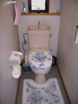 | 窓際に収納スペースを備えたトイレ。家族で塗った珪藻土壁のはけ目が、いい具合に手作り感を醸し出している |