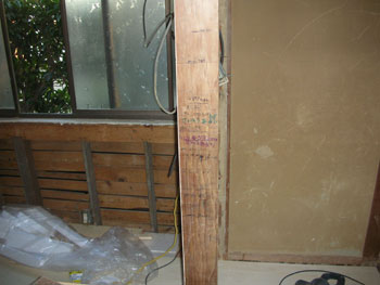 | 構造上取れない柱と柱の間には筋交いを入れて耐震性アップ。金具でしっかり固定します。 | 子供達の成長を追った思い出の柱も残っています。 |
