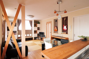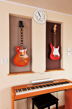 | ご主人のギター置き場を兼ねた専用のニッチが空間のアクセントに。 | ご主人が描いたイラストを元に作った収納棚。お子さんの勉強スペースにもなる。 |