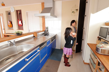 一番変わったのは、かつてキッチンと和室だったLDK。間の段差をなくして一続きの広いLDKへと変更。横幅が270センチと一番大きいサイズの対面キッチンを据え、壁との間を広めにしたため、娘さんもスムーズに手伝えるキッチンに。LDKの窓は通行量の多い生活道路に面しているため、窓の位置を以前よりも上へ移動。下の部分には明かり取りになるガラスブロックをはめこむことで、LDKの明るさが一段とアップし、以前とは印象が一変した。LDKとトイレ、洗面所などの壁は、Sさん一家が自ら珪藻土を丸一日かけて塗り、天井には静電気を帯びない布クロスを採用。新築同然の家へと変わったことに加え、以前に比べて湿気やホコリっぽさを感じず、快適に暮らせるようになったこともリフォームの賜物と、Sさん一家は喜んでいる。