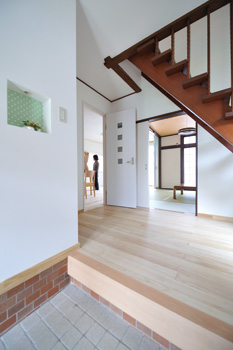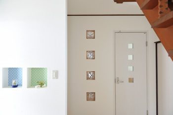 | 開閉扉の淡いエメラルドグリーンが空間の美しいアクセントに。畳は無農薬栽培の熊本産い草で作られたもの | 玄関のニッチやキッチンへ続くドア、壁のガラスブロックなど、統一感をもたせたあしらいが印象的 |