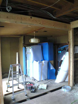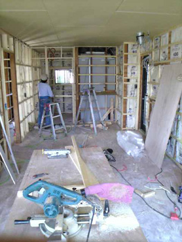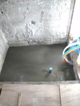 | 間仕切りを取り払って広々としたリビングで大工さんが作業して行きます | 浴室の土間にモルタルを塗りました |