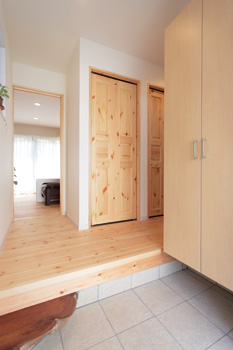 | 階段下のスペースを活かして、施工前の約2倍の広さになった1階トイレ。 | パイン材で作った玄関と収納。小上がりの段差も作ってもらった。 |