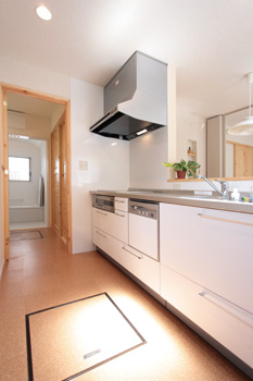LDKには、無垢のパイン材を使ったフローリングと建具、呼吸する布クロス、キッチンの床材には、水に強く丈夫な天然のコルクタイルなど、室内には自然素材があふれている。また、部屋の暗さを解消するために天窓を設置。陽の光をふんだんに取り込む、イメージ通りの明るいLDKに仕上がった。
