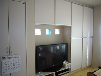 | 内装には呼吸する布クロスを施工して、照明器具が付きました。 | テレビ台設置。リビングのガラスブロックが魅力的です。 |