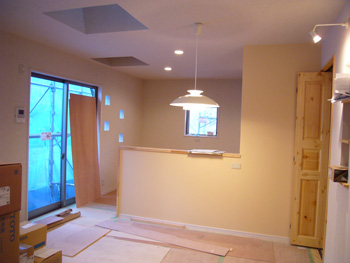 | 光を多く取り込むため、ガラスブロックを随所に設置しています。 | 対面キッチンの壁が立ち上がりました。こちらにもガラスブロックと、明りとりに天窓も2ヵ所造作。 |