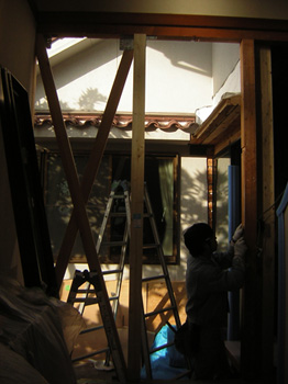 | レンガを積んで、暖かみのある外溝に | 梁と柱でしっかりと補強。広々とした空間に |