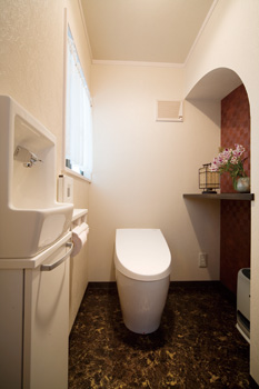 | 隣接する収納の奥行きを狭めて、空間を広げたトイレ。ニッチの下は冬場の暖房設置スペースに。便器はTOTOのネオレストを選択 | ヤマハのシステムバスを導入するため、洗面所とバスの位置を変更し入口も移動。「入口が変わっただけで広く感じる」と奥さま |