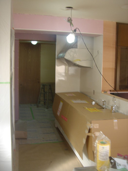 | システムキッチンが設置されました。傷がつかないようにカバーをかけています | パントリーも出来ました |