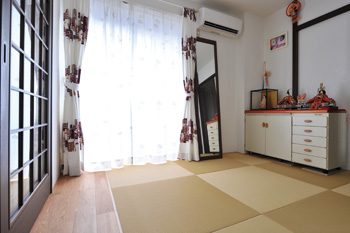 | お孫さんのお昼寝スペースにもなる和室。毛羽立つことがなく、耐久性の高い和紙畳を採用 | キッチン後ろの壁面は、収納スペースとして全面を効果的に活用。食器棚も半透明の引き戸で、どこに何があるかが分かりやすい |
