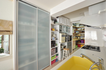 | キッチンからも視覚的な開放感が感じられる。窓をペアガラスにしたことで、結露の悩みを解消できた上、外部から聞こえる音も遮断 | 天井まで収納棚としてめいっぱい空間を活用した便利なパントリー |