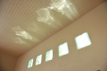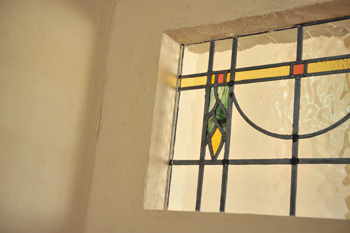 | 壁にあしらったステンドグラスは、奥さまが本物を購入 | 開口部がなく暗かった2階の洋室だが、夕方はエメラルドグリーンのガラスブロックからきれいに光が射し込む |