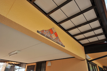| 門柱の内側には、子どもたちの手形が埋め込まれている | 駐車スペースの上にも、奥さまのアイデアでブロックを配した |