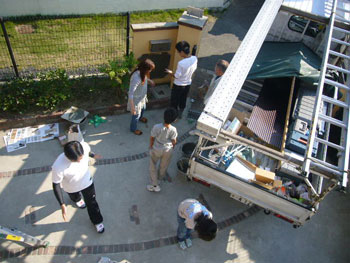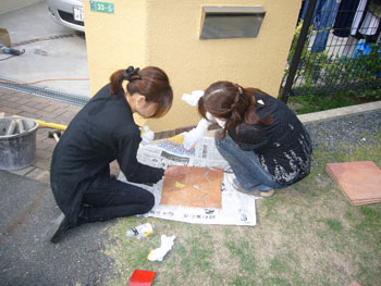 | 家族全員で門柱のところに記念の手形を押すところです | コーディネーターと奥様が一緒にタイルの割り付けを考えています。2人でタイルを貼りました |