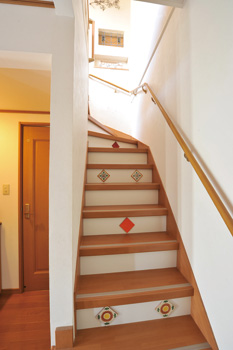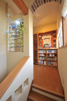 | これまでは押し入れの中にしまいこんでいたご主人の宝物が整然と並んだ踊り場。階段横にもニッチが設けられている | 階段の途中にも、奥さまセレクトのタイルが貼られ、独特の雰囲気が醸し出されている |
