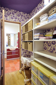 | 使い勝手の良い収納スペースは、主寝室と洗面所の通り道となっている | 収納スペースと同じクロスを採用した、大容量のウォークインクローゼット |