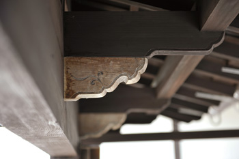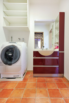 | 場所により太さの違う梁に対し、柱の高さが調整されている。当時の技術の高さを証明している | 水まわりのフロアはテラコッタ調で統一。洗濯は井戸水を活用することも可能 |