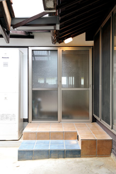 | 縁側兼、広々としたホールはそのまま活用。もともとの床下の高さを解消するため新たに一段設け、メタルタッチな石畳を敷いた玄関 | ブルーとオレンジのタイルを敷いた勝手口。洗濯物やゴミの出し入れがスムーズになった |