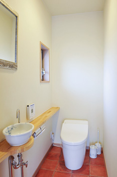 | 家族みんなで入ることができるサイズのお風呂は、もう一つのコミュニケーションの場に | すっきり清潔な印象の来客用トイレ。手洗いボウルは家族用のトイレとおそろいのものを採用 |