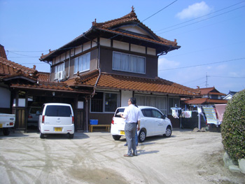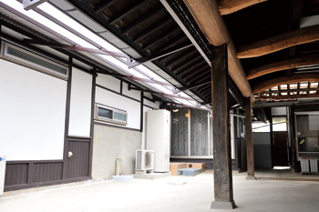 | 手を加えていない離れの長い軒下には、垂木を支える大きな梁が存在感を放つ | 外壁には漆喰が塗り直された。玄関まわりには石畳が敷かれ、上品な佇まいに |