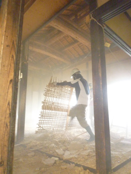 | まずは床壁天井を撤去。まるでビフォーアフターみたいです | 立派な梁が出てきました。土壁が歴史を物語ります |