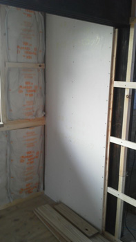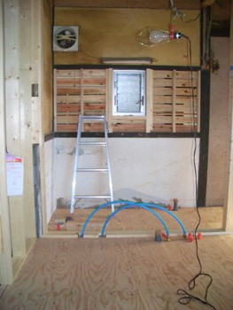 | 小舞壁のため筋交いが入らないところは耐震ボードで補強 | さや管ヘッダーで樹脂配管します |