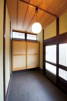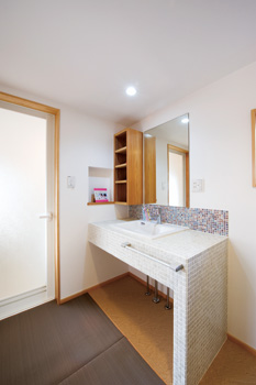 | 家族5人分の靴を収める大容量のシューズボックスを備えた玄関。しっとりと落ち着いた和の空間で来客を出迎えることができる | モザイクタイルが優しいアクセントになった洗面脱衣室。収納棚も完備 |