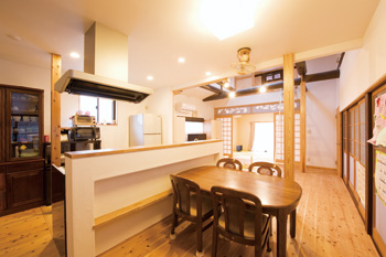 1階は、南側の広縁と2間の和室、トイレを既存のままとし、キッチンとリビング、階段、和室の間仕切りを取り去って、吹き抜けとロフトを備えた大空間LDK+和室に変更。窓際に配置した和室は、リビング空間の延長として使えるほか、夜は障子で仕切って寝室扱いにできる。2階は、廊下の位置を変更し、和室2室を洋室2室にしてトイレを新設。随所に自然素材を採用した。