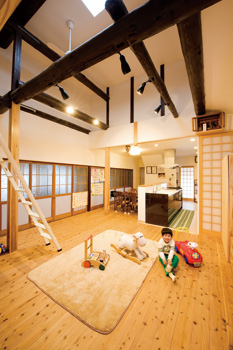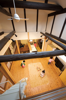 | 重厚感あふれる梁を生かして美しく生まれ変わったLDK。天窓からは明るさがもたらされ、子どもたちは無垢の床が心地良さそう。和室の上のロフトへは梯子を伝って上がる | 収納スペースとして活用しているロフトからの眺め。キッチン側と和室の障子を閉じれば空間を3つに仕切ることができる。そのため、子どもたちが和室で寝ていても、物音をそれほど気にせずにキッチンで洗い物などの家事をすることができる |