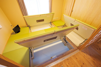 | 2階の洋室は将来子ども部屋にする予定。床はパイン材、壁は珪藻土で自然素材をふんだんに使用 | ほぼ全面が畳下収納スペースになっている和室。これだけ大容量の収納空間が確保されているとかなり便利 |