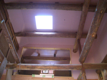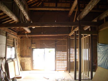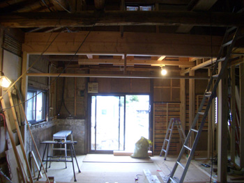 | 内装も設備もいったんすべて解体。昔ながらのしっかりとした構造材が現れました | 大きな桁で補強。開口もしっかりと取れます |