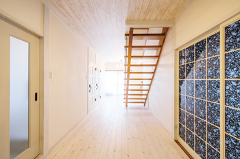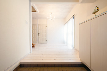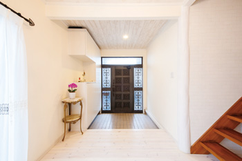 | 広々とした玄関ホールも、洋室のドアを含めてすべて白で統一。右手の玄関収納は、新たに造作して確保した。 | LDKの引き戸にはアンティークのステンドグラスをはめ込んでいる。 |