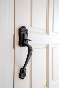 | 玄関ホールの天井には優雅な雰囲気をもつシャンデリアが。 | 既存のドアノブにアイアンスプレーでアイアン風に。予算を抑える手段。 |