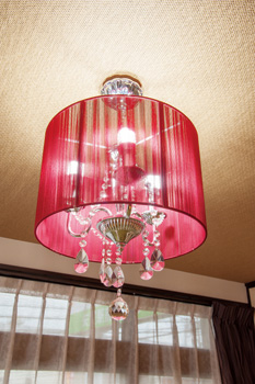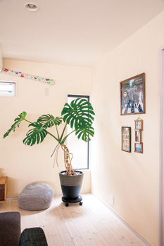 | LDKのコーナーにはリゾート感が漂う大きめの熱帯の観葉植物を置き、ホテルのエントランスをイメージ。 | 奥様が探して集めた照明が、屋内の随所を優しく照らす。 |