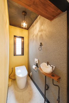 | こちらも奥様が調達した照明。形も色合いも洋風ながら、和室に馴染んでいる。 | 一面のみ異なるクロスを貼った2階トイレ。カウンターの排水管もアイアン風に。 |